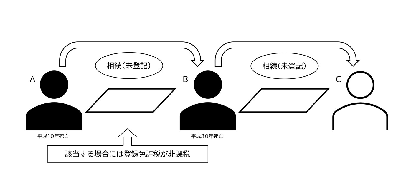 1.所有者不明土地問題 「所有者不明土地問題」とは、不動産登記簿からは現在の土地所有者が判明せず、または判明しても連絡がとれないために起こる問題を言い、例えば、所有者不明土地が荒廃して近隣に迷惑を掛けていたり、所有者不明土地について震災等復興対策などを施そうとしても、所有者と連絡がとれないために対処ができないといったことがあります。 この問題を生じさせる大きな原因の1つに、不動産登記簿上の所有者は死亡しているのに、その相続登記を放置していることが挙げられています。そこで、税制の面から相続登記を促進するため、長期間相続登記が未了となっている土地への対策として設けたのが本制度だと言われています。 2.免税措置の概要 これまで「相続登記の登録免許税の免税措置」が受けられるケースが全部で2つあったところ、令和3年度の税制改正で、全部で3つに増えました。根拠となる法律は、「租税特別措置法第84条の2の3」です。 なお、相続登記の免税措置を利用できるのは、すべて「土地」の相続についてであり、「建物」の相続については免税措置の適用を受けることはありませんので注意が必要です。 (1)相続により土地を取得した方が相続登記をしないで死亡した場合 個人が相続(相続人に対する遺贈を含みます。)により、土地を取得した場合において、その個人が相続登記を受ける前に死亡したときは、その死亡した個人名義にする相続登記は免税となります。言い換えると、相続登記がされていない土地について、さらに相続が発生している場合(数次相続や再転相続などと言います。)に適用を受けることができます。 免税措置の適用を受けることができる数次相続のイメージは次の通りです。 ![]() Aは平成10年に死亡して、土地はBに相続されています。しかし、AからBへの相続登記をしないまま、Bもまた死亡した場合を数次相続と呼びます。この場合に、未了となっているAからBへの土地の相続登記については、登録免許税が免税となります。 Bに名義変更するといっても、B自身は平成30年に死亡していますから、実際にはこの相続登記はBの相続人であるCが行うことになります。その後BからCへ相続登記を行うことになりますが、こちらについては原則どおり登録免許税がかかります。 なお、この事例において、最終的にこの土地を相続するのはCですので、わざわざBにいったん相続登記をする意味はないようにも見えます。不動産登記の手続上も、Bを経由することなく、直接AからCに相続登記ができる場合があり、その際には免税措置の適用はありません。数次相続の場合で免税となるのは、死者名義(B)に相続登記をするときだけであり、存命中の方の名義(C)に相続登記をするときは、原則どおりに登録免許税が課されます。 また、免税となるのは数次の相続に限られません。上記の事例で、Aから土地を相続したBが、自分がなくなる前(例えば平成20年)に、甲に売却した場合も同じように免税の適用があります。 この場合は、買主甲へ名義変更をする前提として、AからBへ相続登記を行う必要がありますが、ここで、既に死亡しているBへの相続登記については免税となります。 しかし、不動産取引においては、不動産を購入したらすぐに名義変更の登記を行いますので、通常はこのような事態になることがあまりないと考えられます。 (2)不動産の評価額が100万円以下の場合 これは、相続する土地の性質に着目して、以下に掲げる2つの要件を満たしていれば免税となるものです。評価の安い土地については、登録免許税や司法書士への手数料など手間をかけて相続登記をすることは躊躇されるため、免税措置を設けることにより、相続登記未了の土地を発生させないようにするのが目的だと言われています。 なお、この要件はどれか1つ満たしていればよいのではなく、2つすべて満たしている必要があります。 ① 土地の相続であること 従来、免税の適用を受けるためには、市街化区域「外」の土地であることが要件とされていましたが、令和4年度税制改正により、免税の対象となる土地に市街化区域が含まれたため、単純に土地の相続であれば免税の適用を受けることができるようになりました。 ※市街化区域とは、市街化を活性化する地域のことで、住宅街や商業施設などがある市街化された区域、またこれらを概ね10年以内で市街化を進める区域のことを言います。 ② 不動産の価額が100万円以下であること 不動産の価額とは、固定資産税評価額のことを言い、この評価額が100万円以下の場合に免税となります。固定資産税評価額は、市区町村役場などで固定資産税評価証明書を取得すれば確認することができます。 複数の不動産をまとめて相続登記する場合には、評価額の合計額で判断するのではなく、1つの土地ごとに100万円以下か否かを判断します。 例えば、A土地(評価90、000円)とB土地(評価1,500,000円))がある場合において、A土地だけを相続登記を行うとき、A土地