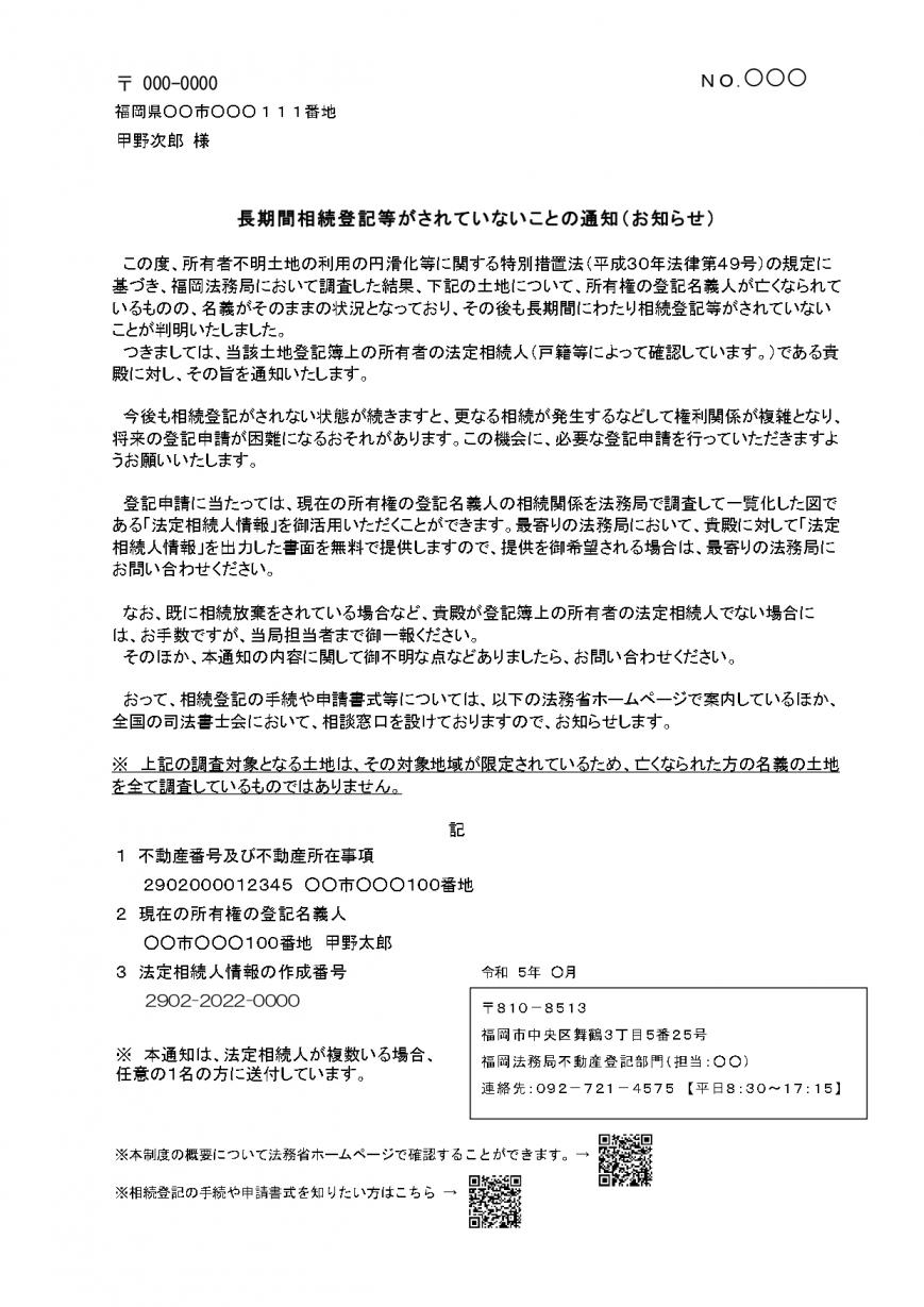 法務局では、長期間にわたり相続登記がされていない土地について、所有権の登記名義人の法定相続人を調査し、その結果を登記するとともに、現在の所有権登記名義人の相続関係を一覧化した図を法務局に備え置く事業を行っています。 この法務局による調査の結果、判明した法定相続人の中の任意の1名に対して、法務局から、長期間相続登記がされていない土地があることをお知らせするとともに、相続登記の申請を促す通知(「長期間相続登記等がされていないことの通知」)を送付しています。 ![]() 「長期間相続登記等がされていないことの通知」が届いたら