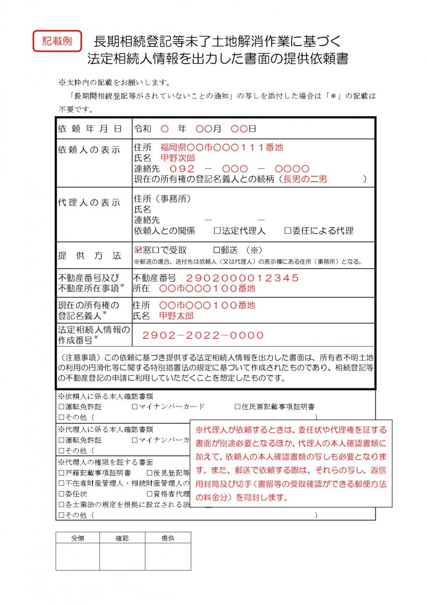 1.なぜ、通知が送られてくるの? 所有者が不明になっている土地の問題解消のため、平成30年から全国の法務局において、長期間(10年以上)にわたって相続登記がされていない土地について、法律に基づいてその土地の所有者の法定相続人を調査し、法定相続人の一覧図(法定相続人情報)を作成して、土地の所在地を管轄する法務局へ備え置く作業が進められています。 この作業が完了した土地については、その土地の登記簿に長期間相続登記がされていない旨の登記がなされ、また、この調査で判明した法定相続人の中の任意の1名の方に対し、相続登記の促進を目的として法務局から通知書(「長期間相続登記等がされていないことの通知」)が送付されます。 「長期間相続登記等がされていないことの通知(お知らせ)」の見本 ![]() 2.通知が届いたらどうすればいい? 法務局から通知が届いた場合のその後の手続は次のとおりです。 (1)通知を持って法務局に行くなどして、物件や法定相続人情報を閲覧する 法務局から送られてくる「長期間相続登記がされていないことの通知」には、不動産の所在や法定相続人情報の作成番号が記載されています。 法務局では、通知を受け取った方に対して、相続登記に活用できる法定相続人情報の提供を無料で行っています。全国どこの登記所でも、法定相続人情報の提供を依頼することができますので、受け取った通知を持って最寄りの法務局へ行くか郵送するなどして物件や法定相続人情報を確認します。 なお、依頼の際には、法務局で本人確認を行いますので、依頼する方の氏名及び住所を確認できる公的書類(運転免許証、マイナンバーカード、住民票の写し等)を持参するのを忘れないようにしましょう。郵送での提供を依頼する場合は、その旨を依頼書に記載したうえで、前述の公的書類に加え、返信用の封筒及び郵便切手を同封します。その際、返信方法については、書留郵便など郵便物の受取確認ができる方法にしなければならない点に注意が必要です。 また、この依頼は親族や後見人などの法定代理人のほか、司法書士などの資格者代理人に委任することもできます。 「法定相続人情報を出力した書面の提供依頼書」の記載例 ![]() (2) どのように相続するかを決める 法定相続人情報には、法定相続人の一覧図が記載されており、現在の所有者の相続人に関する情報(氏名や住所)が記載されています。これにより相続人が誰か分かったら、法定相続分で相続登記をするか、遺産分割協議をして相続人の中の一部の人が取得するかを決めます。 ただし、遺産分割協議をする場合、相続人の全員が参加して行う必要がある点と協議がまとまったら遺産分割協議書を作成し、全員が署名したうえで実印を押印し、印鑑証明書が必要になる点に注意が必要です。 (3)相続登記を申請する 法定相続分で相続する、あるいは遺産分割協議により一部の相続人が取得するなど、相続する方法が決まったら、土地の所在地を管轄する法務局で相続登記を行います。 3.司法書士に依頼することもできる 「長期間相続登記がされていないことの通知」が送られてきた場合、その後の手続を司法書士に依頼することもできます。 この場合には、依頼者から通知を預かって法務局で物件や法定相続人情報を閲覧したり、相続人全員で遺産分割協議がまとまった場合の書類を作成したり、相続登記の代理申請をするなどして、手続をサポートします。 4.通知に関する注意点 (1)通知は相続人全員に対して送られてくるわけではない 「長期間にわたり相続登記等がされていないことの通知」は、法定相続人全員に通知しているわけではなく、相続人の中の1人に通知していますが、このことに特別な意味があるわけではありません。 相続登記は,不動産を管轄する登記所に申請する必要があるため,相続人となる方のうち,当該不動産の近くに居住されている方や親等的に近い方など,登記名義人となっている方を知っていると思われる方に対して通知をしているようです。 したがって、通知された方以外の相続人は、相続登記が未了であることに気付いていない可能性があります。 (2)相続放棄をしていても届くことはある すでに相続放棄をしていた場合でも通知書が送られてくることはあります。 相続放棄をしたかどうかは戸籍に記載されないので、法務局が相続人だと判断して通知することもあるからです。相続放棄をしている場合や、通知書が送られてきた後に相続放棄をした場合は、通知書に記載されている電話番号に連絡しましょう。 (3)法定相続人情報は他の相続手続では使用不可 法定相続人情報は、あくまでも相続登記等の未了を解消するために使用できる情報であるため、他の相続手続で使用することはできません。例えば、通知が送られてきた後に相続放棄をする場合、「法定相続人情報」を相続放棄の手続で利用することはできず、改めて(ご自身の負担で)戸籍収集を行う必要があります。 この点、法定相続