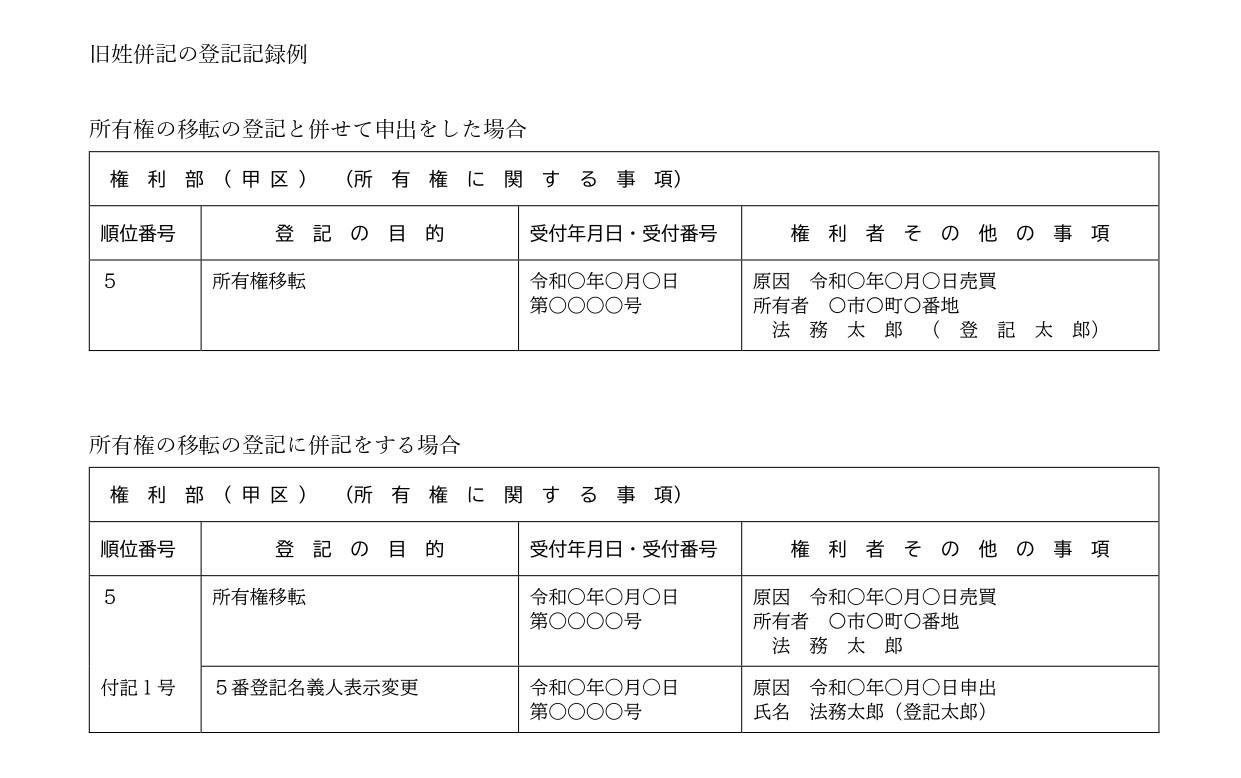 1.登記記録のイメージ 令和6年4月1日から、不動産登記においても旧姓を併記することができるようになりました。この旧姓併記の申出をすることで、所有権の登記名義人の氏名の後に括弧を付して旧姓及び名前を併記されることになります。 ![]() 2.旧姓併記ができる者 旧姓が併記できるのは現在の所有権登記名義人の氏名のみであり、これ以外の者は旧姓併記の対象とはなりません。 したがって、例えば表題部の所有者や仮登記の登記名義人、住宅ローンの抵当権を設定する際の債務者の氏名、過去に所有権の登記名義人であった者について旧姓を併記することはできません。 また、日本の国籍を有しない者については、旧姓を併記することはできません。 2.併記することができる姓 所有権の登記名義人の氏名に併記できる旧姓は、姓に変更があった者が過去に使用していた姓であって、その者の戸籍あるいは除籍に記録がされている姓に限られます。ただし、旧姓が現在と同じ姓であった場合には、登記記録上の姓と同一の旧姓を併記する申出は認められません。 例えば「民事太郎」→「登記太郎」→「民事太郎」(現在)の順に姓が変わった場合に「民事太郎(民事太郎)」と併記する申出は認められません。 また、併記できる旧姓は1つに限られ、複数の旧姓を併記することはできません。 3.旧姓併記の申出をする方法 所有権の登記名義人の氏名に旧姓を併記してもらうには、次の(1)及び(2)の方法があります。 (1)登記申請に伴って旧姓の併記の申出をした場合 例えば、所有権保存や所有権移転など、新たに所有権の登記名義人となる登記のほか、所有権の登記名義人の氏についての変更の登記又は更正の登記の申請に併せて旧姓の併記の申出をする場合です。ただし、名前や住所のみの変更の登記の申請と併せて申出をすることはできません。 なお、初めて旧姓の併記をする場合は、登記記録に記録するより前に使用していた旧姓であれば、登記する姓と同一でない限り、直近の旧姓であるかどうかを問わず併記が可能です。 例えば、「民事太郎」→「登記太郎」→「法務太郎」(現在)という順に姓が変わった場合に、登記記録に新たに記録する氏名が「法務太郎」であるときの併記する旧姓は「民事太郎」と「登記太郎」のいずれでも可能です。 また、既に旧姓が併記されている所有権の登記名義人について、氏の変更の登記又は更正の登記と併せて旧姓併記の申出をする場合は、現在の登記記録に記録されている旧姓又はその旧姓より後に使用していた旧姓について併記が可能です。 例えば、「司法太郎」→「民事太郎」→「登記太郎」→「法務 太郎」(現在)の順番で姓が変わった場合において、変更前の登記記録上の氏名の表示が「登記太郎(民事太郎)」であるときには、現在の「法務太郎」に変更する登記と併せて、「民事太郎」又は「登記 太郎」を併記する申出をすることができます。 (2)登記申請を伴わない旧姓併記の申出をした場合 既に登記されている所有権の登記名義人が、(1)のような登記の申請を伴わずに旧姓の併記の申出をする場合です。ただし、旧姓併記の申出人の氏名が所有権の登記名義人の氏名と異なる場合は、旧姓併記の申出の前提として氏名変更の登記をしなければなりません。 なお、既に所有権の登記名義人の旧姓が併記されているときは、登記されている旧姓より後に使用していた旧姓に限り申出をすることができます。 4.おわりに 不動産登記に関しては、令和6年4月1日以降、旧姓併記が可能となったり、DVやストーカー被害者等に配慮した住所表記のなど多くの点で改正がなされています。 不動産登記のことで分からないことがあれば、専門家である司法書士へご相談ください。 |